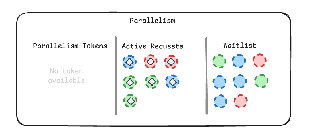 Note that each step above corresponds to a separate workflow run. Because this workflow is sequential, each workflow run has only one pending step at a time. In workflows with parallel branches, multiple steps from the same workflow run may appear in the schedule simultaneously. Parallelism slots are consumed by running steps. If no slots are available, new steps enter the waitlist until resources free up: